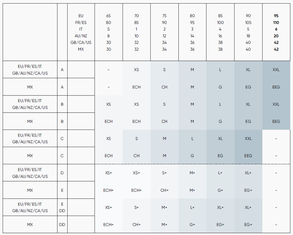 3. Gängige EU-Unterbrustumfänge: 60, 65, 70, 75, 80, 85, 90, 95, 100 cm