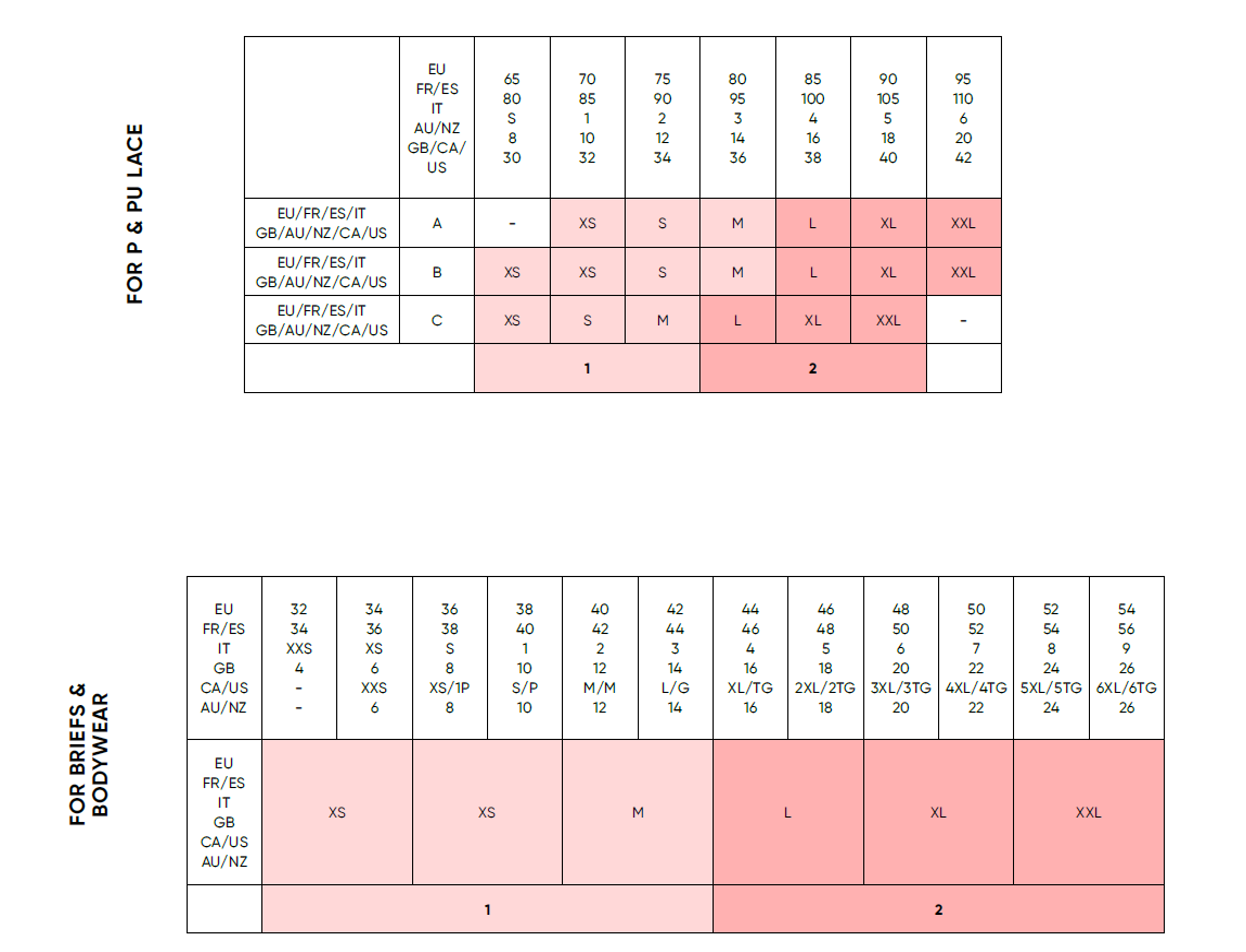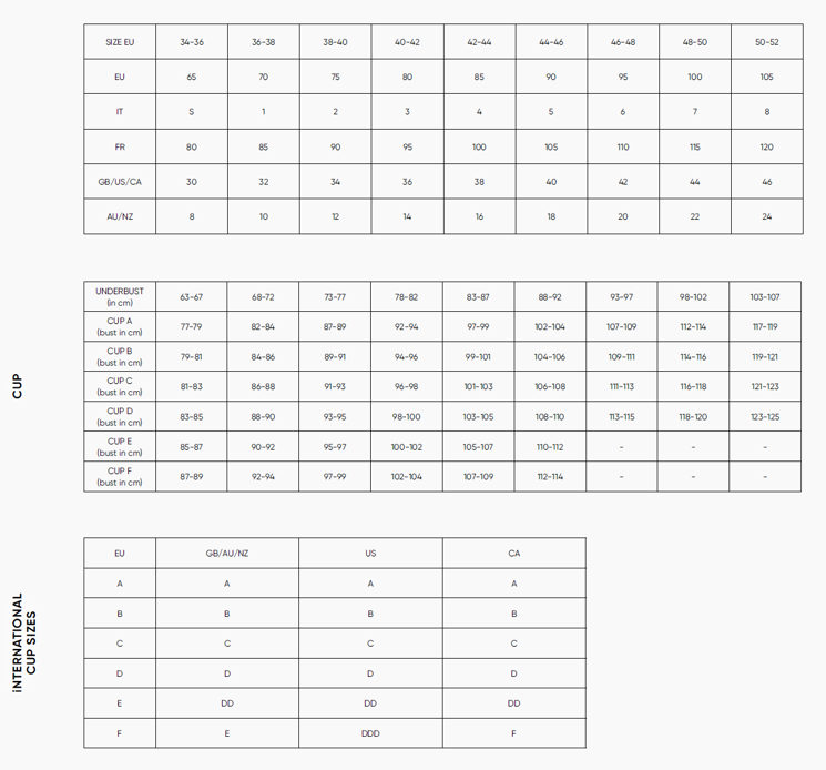 • Beispiel: Größe 75C bedeutet Unterbrust 75 cm, Cup C